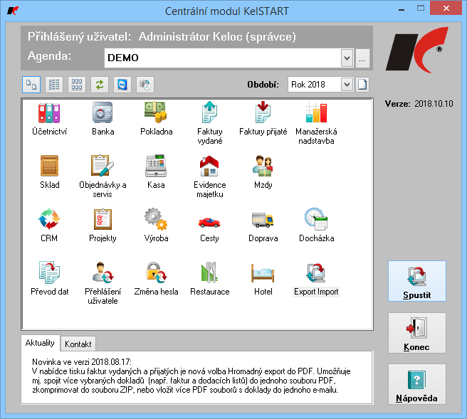Omezena jen na 200 záznamů v součtu řádků deníku, faktur, řádků faktur, skladových pohybů a mezd... Funkce jsou v hrubém přehledu: